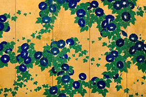 江戸時代後期、琳派最後の画家であり琳派の異才と言われた鈴木其一の作品「朝顔図屏風」がアメリカのメトロポリタン美術館に名品として飾られている。金箔に描かれた「朝顔」は、みずみずしい花の色で画面の中で咲き誇っている。其一の最高傑作である。この青というよりナス紺に近いぽってりとした朝顔の色がなんとも印象に残る。岩絵の具の群青を丹念に塗り重ねたのではないだろうか。金箔の金と緑青のみどりと群青の青の三色でほとんど構成されている。朝顔の質感をたかめ、斬新な構図で画面を埋めている。これらの朝顔の表情は、今にも画面から落ちて来そうである。抽象的あり絵画的でもある、朝顔図屏風はエネルギーを含んで咲いている。朝顔は、昼近くにはしぼんでしまうこれがじつにはかなげ。しかし、地をはうように咲き誇っている其一の朝顔は、生命の強さを感じてしまう。上にのびるのではなく、地をはう朝顔。これこそが其一が描きたかった朝顔なのだろう。よく光琳の「燕子花屏風」と比較されるが、装飾性と空気感を比較してみたらおもしろいかもしれないな・・・。