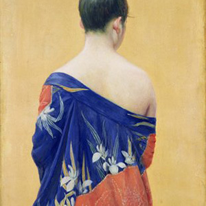 岡田三郎助の代表的な作品で「あやめの衣」という作品があるが、顔が描かれていない後ろ姿の作品だ。それでも実に色ぽくて思わずこっちを向いてよと言いたくなるほどだ。着物に描かれたあやめの作品につい目がいってしまうが、後ろ姿であるがゆえに全体像がとても気になる。このあやめの着物をまとった女性はどんなお顔なのだろう・・・。
