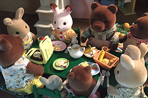 断捨離をしていて救い出したおもちゃがいくつかある。子供が幼い頃に遊んでいた「シルバニアファミリー」のお人形とお家。もう、25年も押入れの中で静かに眠っていたのだ。断捨離をきっかけに押入れの中で眠っている不必要なものをすべて整理することにしたのだが、このシルバニアファミリーを箱から出して並べ始めたらさあ大変。もう楽しくて楽しくてファミリーの一員になり、自分がクマのお母さん役をやったり、うさぎのお母さんをやったり、一人十役で遊びだしてしまった。危ない危ない(笑)バーベキューパーティーをしてみたり、お茶会をしてみたり、畑に水やりをして野菜の収穫までしてしまう。寝る時間が来ると布団を敷いて寝かしつける。クマの家族、うさぎの家族はやっと一日をを終える。そこまで遊んで私も満足。こんなことを続けていたらスーッと夢の世界に入っていきそう。毎日毎日シルバニアの家族と遊んでいたら、そのうち私も家族の中にいたりして・・・。夏のミステリィ~。「きーぼー、どこにいるんだ~」「ここよ~」ちょっとシュールなお話でした。少し寒くなったかな(笑)