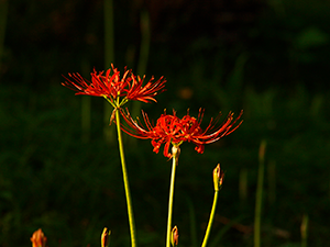夏の間は、暑くて庭の雑草を刈る気にもなれなかった。ここ数日は、涼しいので雑草を刈ることにした。伸び放題の雑草を見ていると思わず心が萎える。しかし、刈らねばね。汗を流し流し刈って、ゴミ袋二袋。ふ~疲れた。でも、スッキリしたなぁ。自分としては満足。それから何日かして庭を見たら、すっきりした庭に、一本の茎がすーっと出てきた。何だろう。せっかく綺麗に刈ったのに・・・。次の日また庭を見てみると、茎の先に赤い蕾がでてきた。何の花だろう。不思議に思っていた。抜こうと思えば抜くことができたのに、なぜか抜くことが出来なかった。抜かないでとその花が主張している気がした。今日は9月23日お彼岸だ。朝庭を見てみると、彼岸花が一本咲いていた。お彼岸をまるで待っていたかのように咲き誇っている。お義父さんと、お義母さんの魂がまるで宿っているかのように堂々と咲いている。「今日は、お彼岸よ」と教えてくれているのだ。何だか感動した。たった一本の彼岸花がすごく神々しかった。何気ない日常に非日常を感じてしまった一日だった。